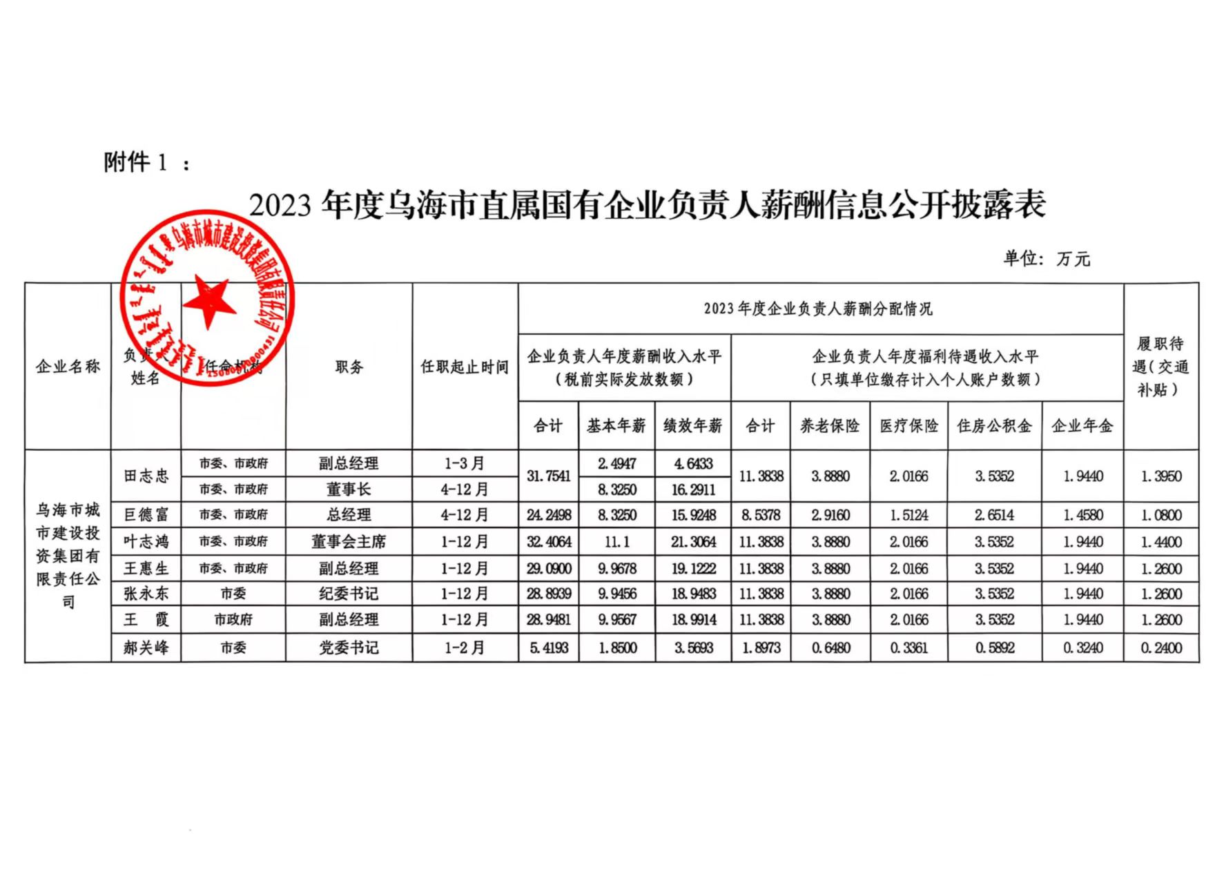 2023年度烏海市直屬國(guó)有企業(yè)負(fù)責(zé)人薪酬信息公開披露表