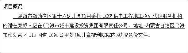烏海市海勃灣區(qū)第十六幼兒園項(xiàng)目委托10KV供電工程施工招標(biāo)代理服務(wù)機(jī)構(gòu)競價(jià)公告