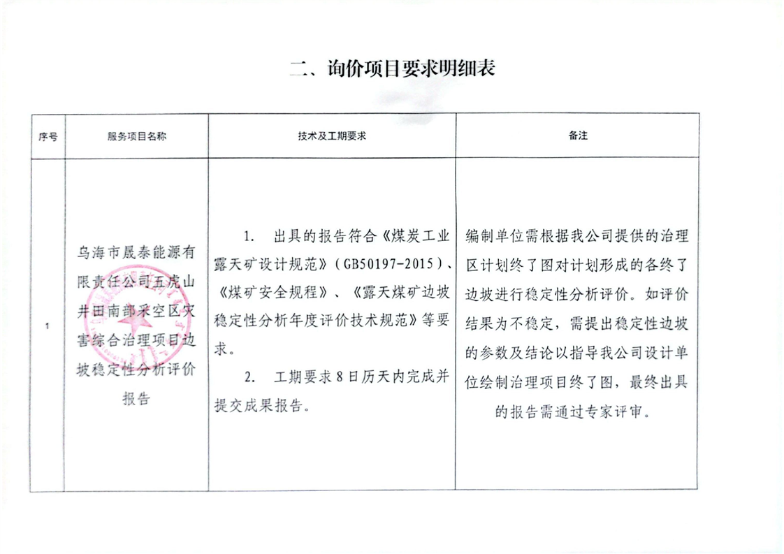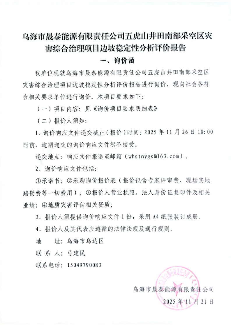 - 2025-12-16烏海市晟泰能源有限責(zé)任公司五虎山井田南部采空區(qū)災(zāi)害綜合治理項(xiàng)目生態(tài)環(huán)境損害司法鑒定評(píng)估項(xiàng)目詢價(jià)公告