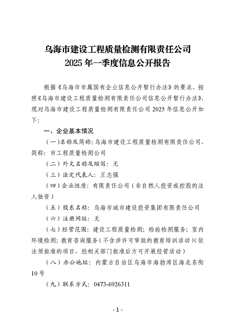 烏海市建設(shè)工程質(zhì)量檢測(cè)有限責(zé)任公司2025年一季度信息公開(kāi)